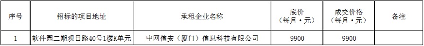 根據思明區國有企業(yè)資產(chǎn)出租管理的相關(guān)制度,我司2019年6月10日上午9:00起于觀(guān)音山營(yíng)運中心2號樓2層2號會(huì )議室進(jìn)行公開(kāi)招租現場(chǎng)開(kāi)標,現通過(guò)思明控股網(wǎng)站對外發(fā)布成交公告,內容如下: