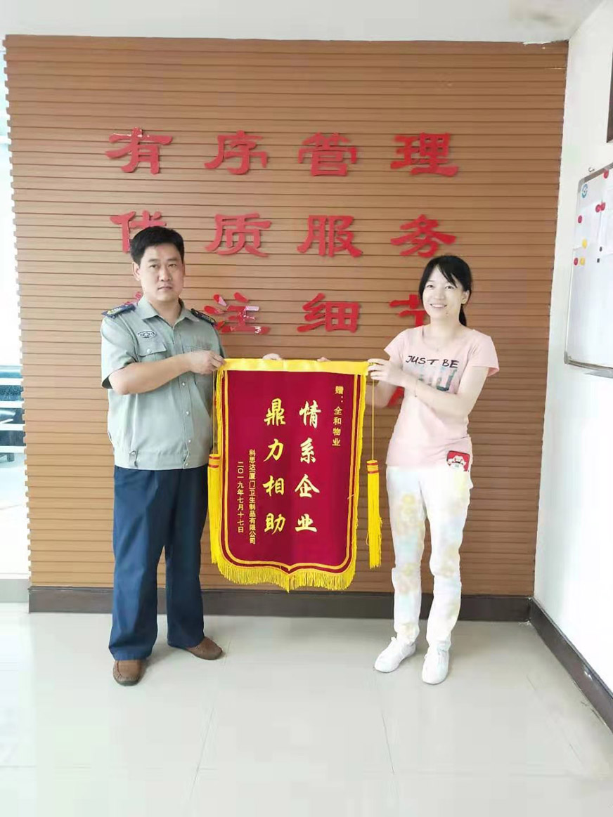 廈門(mén)市全和物業(yè)管理有限公司同安工業(yè)集中區思明園服務(wù)中心的勇士們處置及時(shí),臨危不亂,為業(yè)主挽回了巨大損失,獲得業(yè)主的高度贊揚與認可,被送來(lái)“情系企業(yè),鼎力相助”的錦旗。