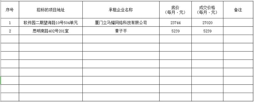 根據思明區國有企業(yè)資產(chǎn)出租管理的相關(guān)制度,我司2019年11月18日上午9:00起于觀(guān)音山營(yíng)運中心2號樓2層2號會(huì )議室進(jìn)行公開(kāi)招租現場(chǎng)開(kāi)標,現通過(guò)思明控股網(wǎng)站對外發(fā)布成交公告,內容如下: