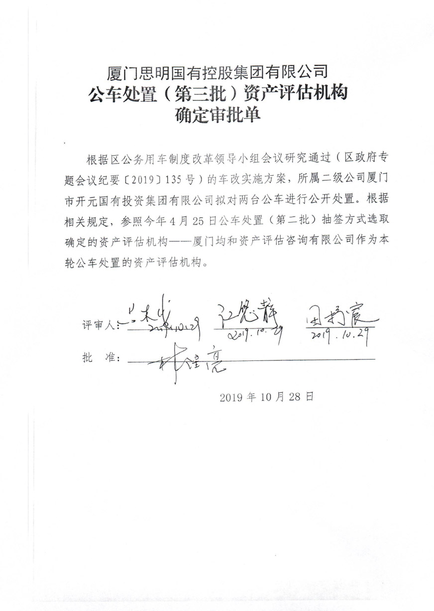 根據廈門(mén)市思明區人民政府關(guān)于區屬?lài)筌?chē)改實(shí)施方案專(zhuān)題會(huì )議紀要(〔2019〕135號)及思明控股《關(guān)于落實(shí)車(chē)改實(shí)施方案相關(guān)事宜的通知》(思明控股辦〔2019〕9號)文的相關(guān)精神。我司委托廈門(mén)均和房地產(chǎn)土地評估咨詢(xún)有限公司對公車(chē)處置(第三批)的資產(chǎn)進(jìn)行評估,該公司已向我司提交資產(chǎn)評估結果初稿?,F將評估結果進(jìn)行公示,如有異議,歡迎來(lái)電來(lái)函反映。