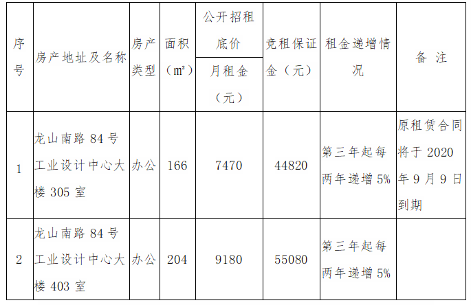 根據國有企業(yè)資產(chǎn)出租管理相關(guān)制度,我司決定對位于思明區龍山南路84號工業(yè)設計中心305、403單元房產(chǎn)對符合入駐條件的意向承租人進(jìn)行公開(kāi)競價(jià)招租,具體信息如下: