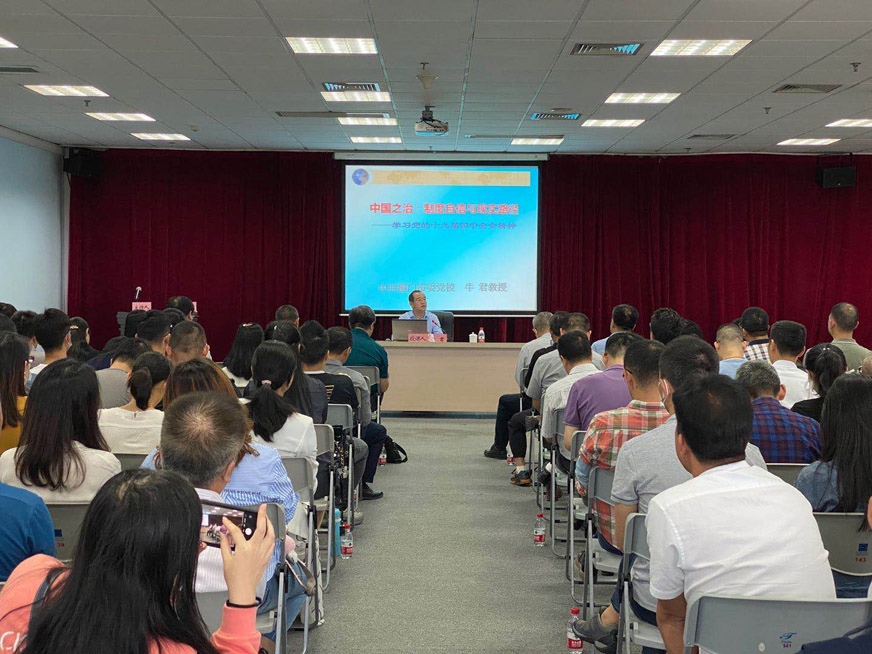 為進(jìn)一步學(xué)習貫徹落實(shí)黨的十九屆四中全會(huì )精神,10月30日下午,控股集團黨委邀請廈門(mén)市委黨校黨建教研部副主任、教授牛君作專(zhuān)題宣講。會(huì )議由控股集團黨委副書(shū)記潘用樹(shù)主持??毓杉瘓F領(lǐng)導班子、所屬二級子公司中層副職(含所屬三級子公司副職)以上人員、全體在廈黨員以及觀(guān)音山園區黨建聯(lián)盟成員單位代表等近200人在會(huì )場(chǎng)聆聽(tīng)宣講。