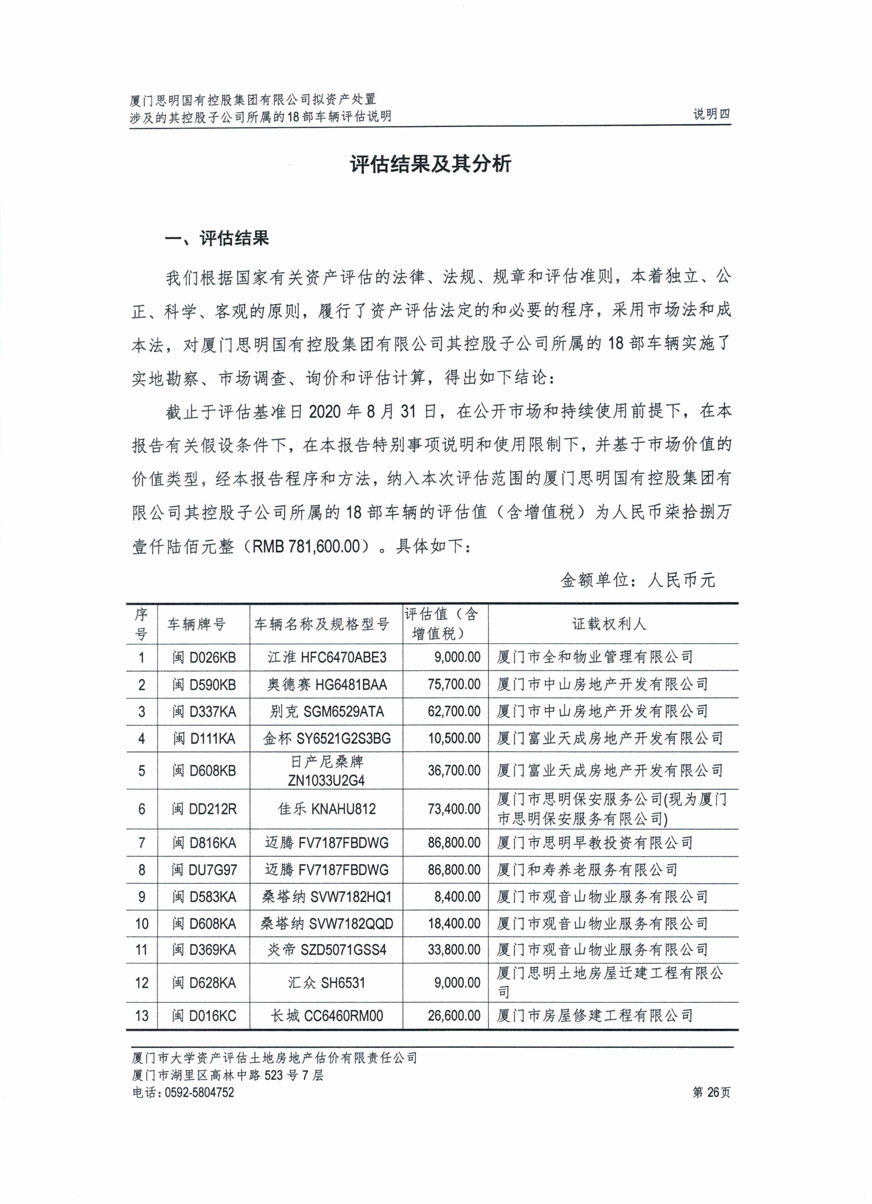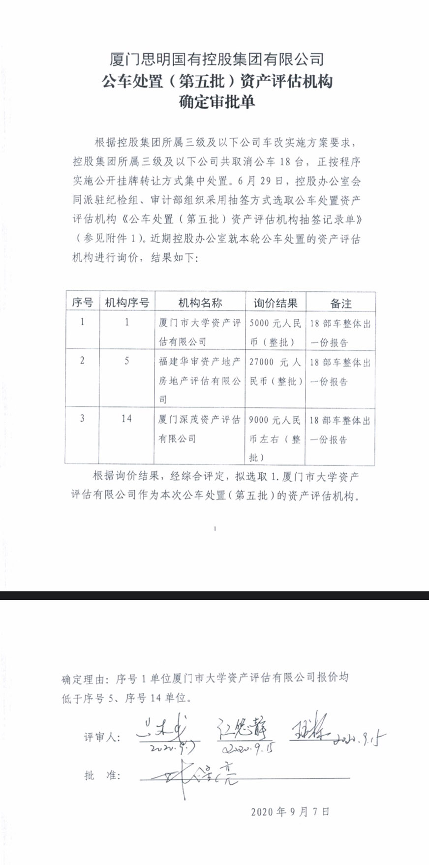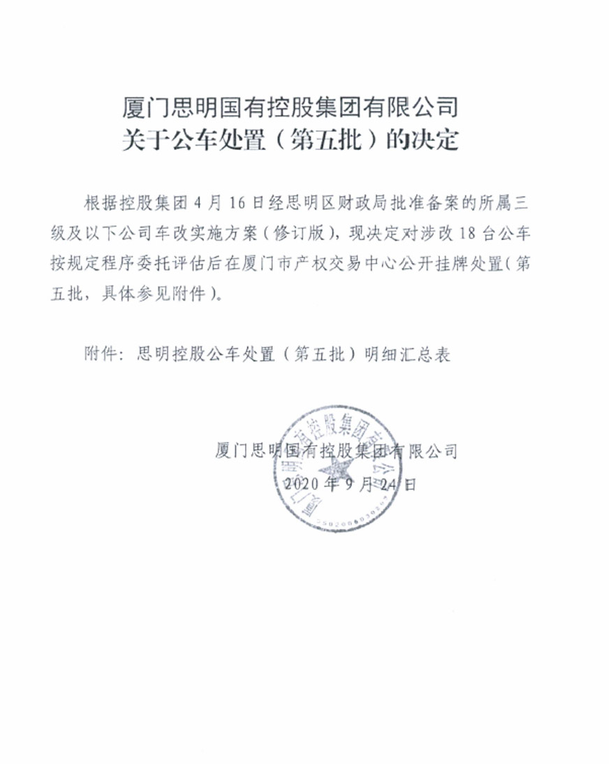 根據2020年6月5日我司報經(jīng)思明區財政局批準備案的《關(guān)于報送所屬三級及以下公司車(chē)改實(shí)施方案事宜的情況說(shuō)明》相關(guān)文件精神,我司委托廈門(mén)市大學(xué)資產(chǎn)評估土地房地產(chǎn)估價(jià)有限責任公司對公車(chē)處置(第五批)的車(chē)輛進(jìn)行評估,該公司已于11月10日向我司提交資產(chǎn)評估結果?,F將評估結果進(jìn)行公示,如有異議,歡迎來(lái)電來(lái)函反映。