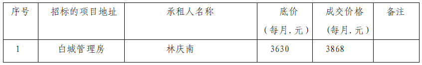 根據國有企業(yè)資產(chǎn)出租管理相關(guān)制度,我司于2020年10月26日上午10:30在廈門(mén)文創(chuàng )展示中心A9棟一層會(huì )議室進(jìn)行思明區環(huán)島路6個(gè)站點(diǎn)管理房分別公開(kāi)招租現場(chǎng)開(kāi)標,現通過(guò)現場(chǎng)租賃物對外發(fā)布成交公示,內容如下: