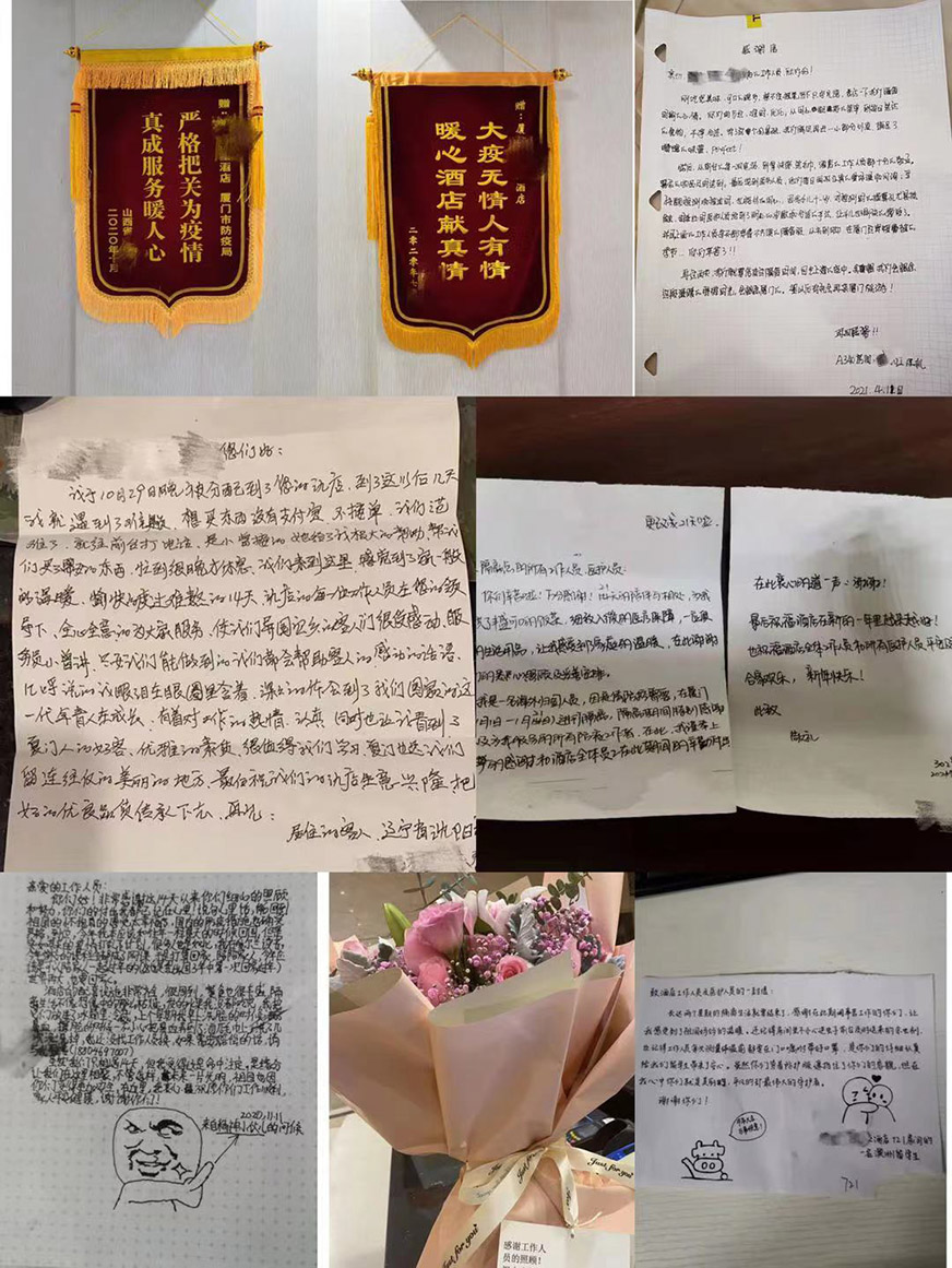 在這400多個(gè)日日夜夜中,我們思明區的隔離酒店專(zhuān)班共接收7萬(wàn)多名入境旅客。在接收過(guò)程中分流到酒店的入境人員大多數對廈門(mén)及各地的防疫政策的不了解、不理解及需要引導等,入境旅客中有情緒激動(dòng)的老人、有懷孕37周多的待產(chǎn)婦、也有生活無(wú)法自理的殘疾人、精神病患者、更有遇到困難尋求幫助的旅客,需要我們酒店專(zhuān)班工作人員耐心細致解釋廈門(mén)市及各地的防疫政策、及時(shí)疏導隔離人員焦慮的情緒,并引導隔離人員用良好的心態(tài)度過(guò)酒店留觀(guān)隔離期,體現全心全意為境外人員服務(wù)的高尚情懷。通過(guò)我們專(zhuān)班人文關(guān)懷、解難幫困,做到每個(gè)留觀(guān)人員最終理解這是為了全國人民的健康和為國家的安全應盡的義務(wù),都積極主動(dòng)配合,積極在公眾平臺上傳導正能量,隔離期間常有關(guān)心、慰問(wèn)工作人員、隔離結束后常有留下字條、定制錦旗等溫暖舉動(dòng),通過(guò)寫(xiě)感謝信、送鮮花、錦旗等方式表達感謝,專(zhuān)班工作得到旅客的認可,在工作上的委屈、苦累和汗水瞬間化為烏有。