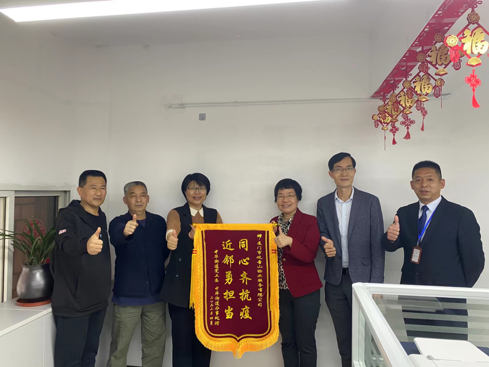 4月20日下午,中華街道黨工委副書(shū)記、街道辦主任王雪梅率街道四級調研員嚴開(kāi)松、黨政辦負責人蘇江圳一行給思明控股觀(guān)音山物業(yè)所屬中山路服務(wù)中心送上錦旗和慰問(wèn)信,感謝思明控股集團觀(guān)音山物業(yè)中山路服務(wù)中心團隊全力配合協(xié)助街道疫情防控工作,對團隊致以崇高的敬意和衷心的感謝。