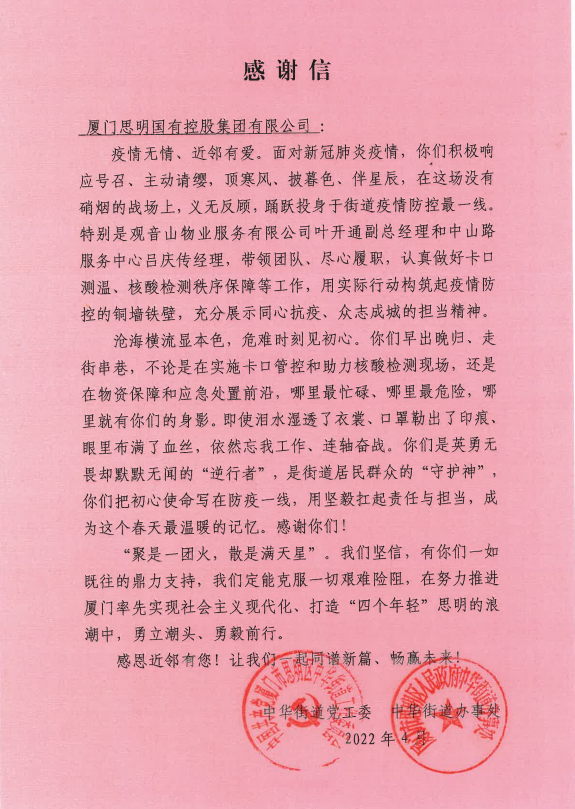 正如中華街道感謝信中所說(shuō)“聚是一團火,散是滿(mǎn)天星”!觀(guān)音山物業(yè)團隊始終用堅毅扛起責任與擔當,義無(wú)反顧,勇毅前行,努力做街道居民群眾的“守護者”,做美麗廈門(mén)幸福思明的“踐行者”。