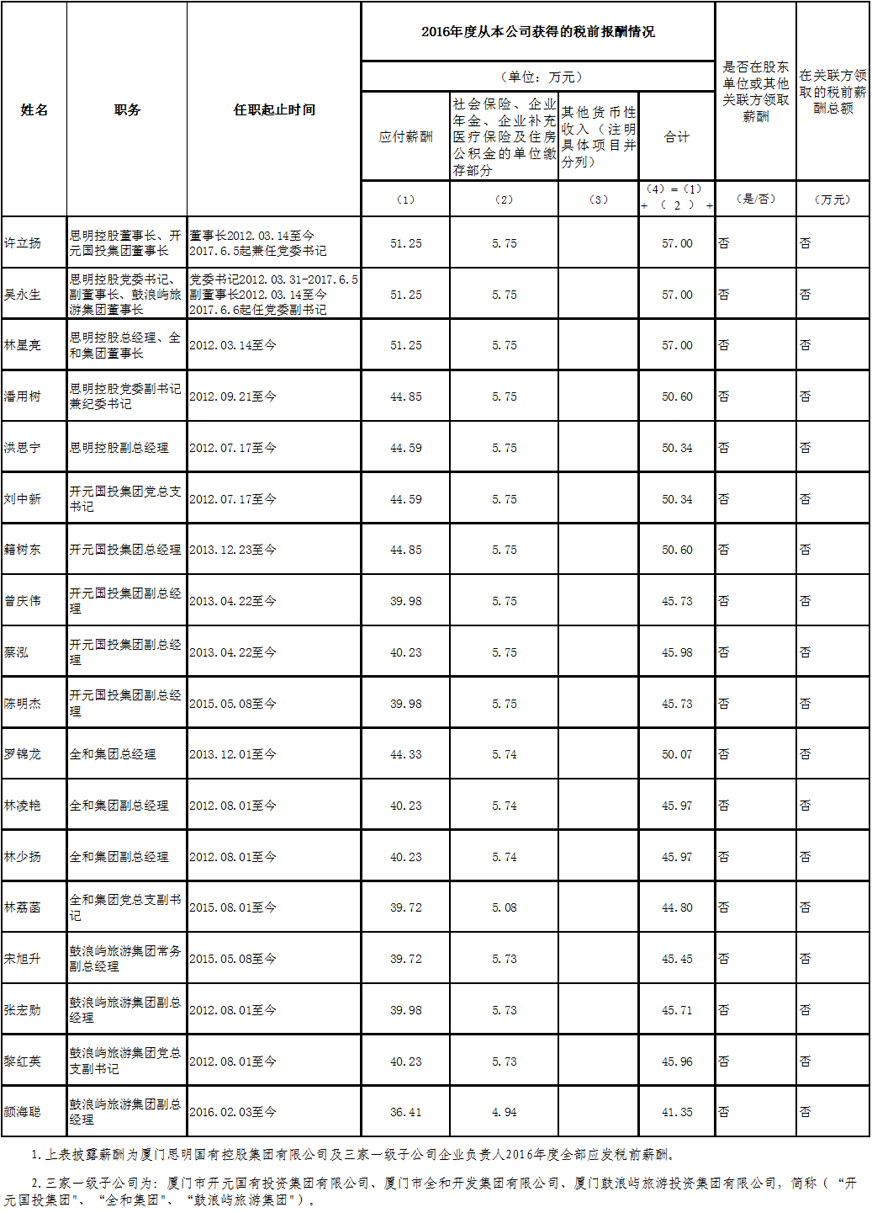 廈門(mén)思明國有控股集團有限公司及三家一級子公司企業(yè)負責人年度薪酬信息披露表