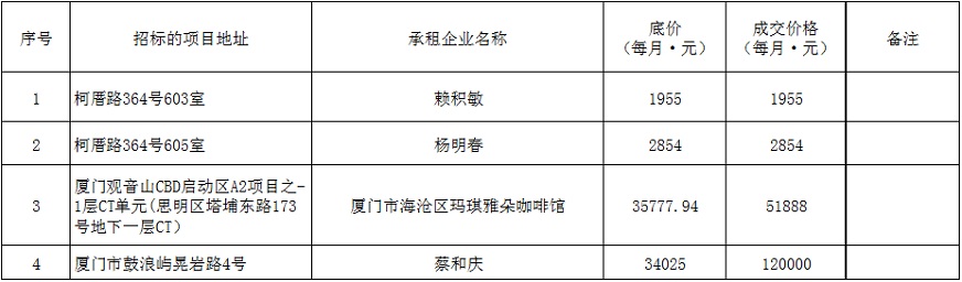 根據思明區國有企業(yè)資產(chǎn)出租管理的相關(guān)制度,我司2019年4月1日上午9:00起于觀(guān)音山營(yíng)運中心2號樓2層2號會(huì )議室進(jìn)行公開(kāi)招租現場(chǎng)開(kāi)標,現通過(guò)思明控股網(wǎng)站對外發(fā)布成交公告,內容如下: